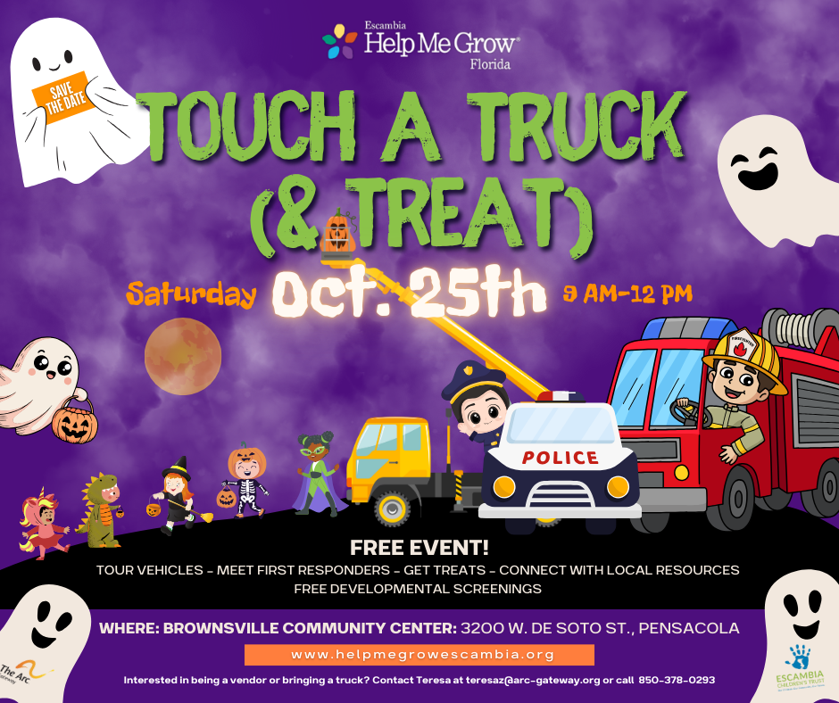 Come explore big trucks, meet first responders, collect candy, and enjoy a FREE safe, fun Halloween celebration! Plus- FREE developmental screenings and local community resources will be available.
